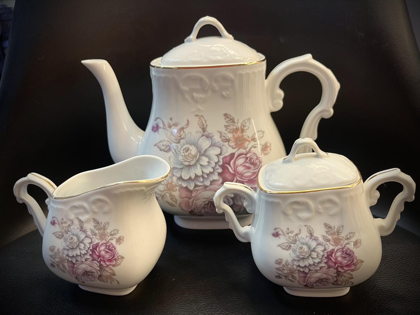 Bule + leiteiro + açucareiro.