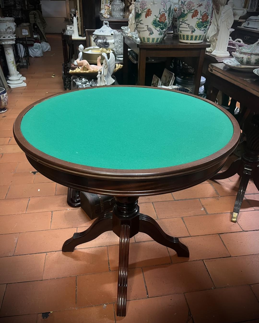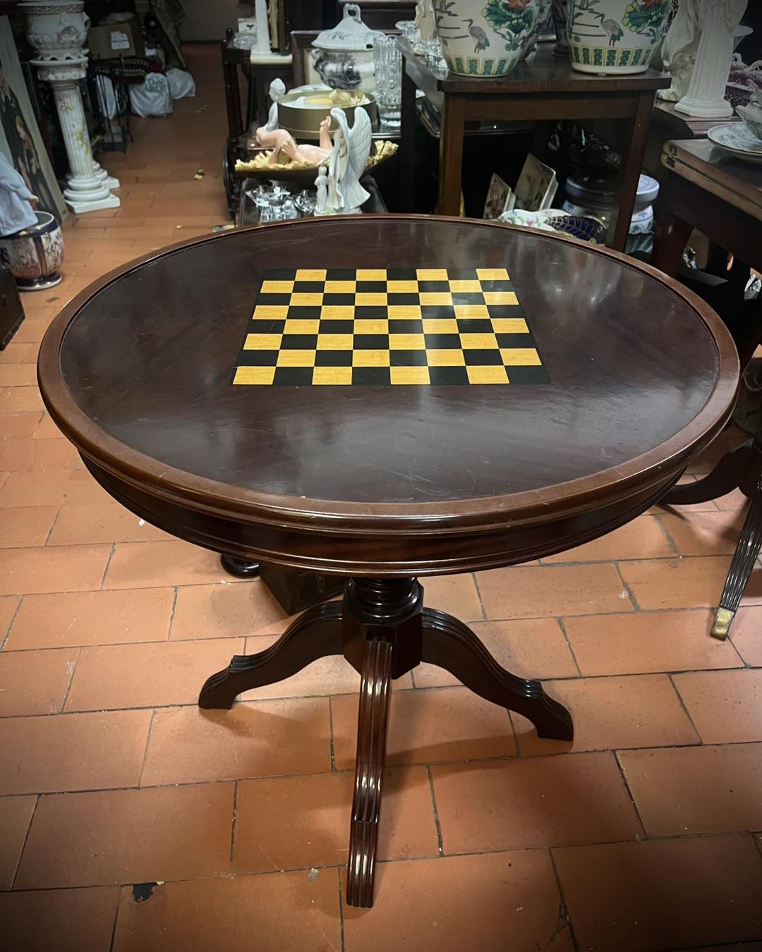Mesa de jogo de tampo reversível com tapete ou tabuleiro de damas ou xadrez.